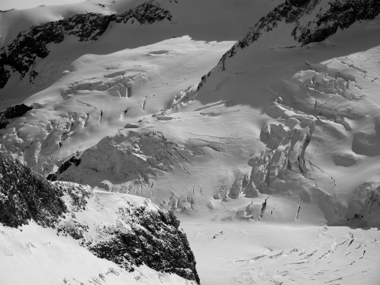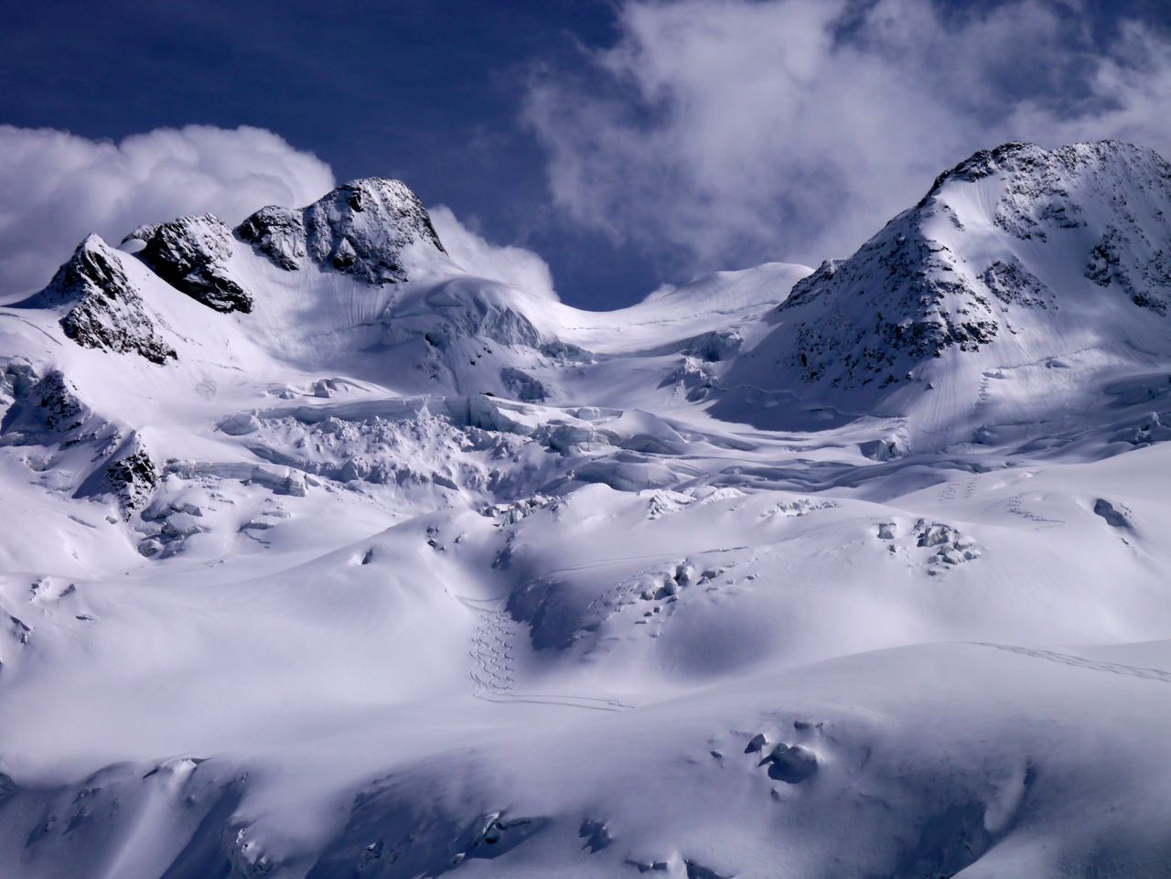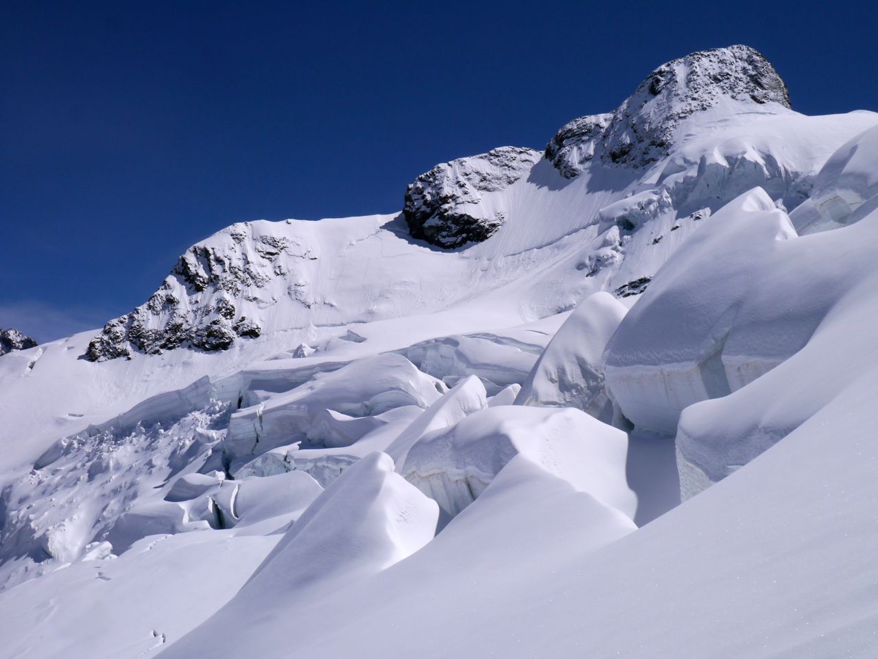 J5 : Montée au Piz Palu, ou au Passo di sasso Rosso, avant la descente grandiose sur l'Alp Grum par le Vadret di Palu et son immense cirque glaciaire. retour en train jusqu'au point de depart. OU ascension du Piz Bernina, et descente jusqu'au refuge Marinelli.