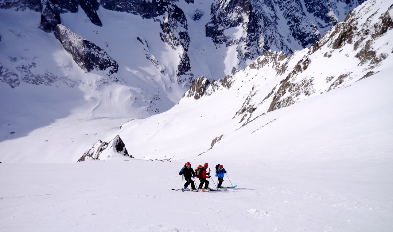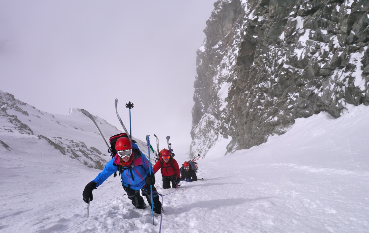 Pente raide, glaciers, rappels, remontée de couloirs encordés, nombreuses manipulations pour mettre/enever les peaux de phoques, crampons etc en font un raid très complet.