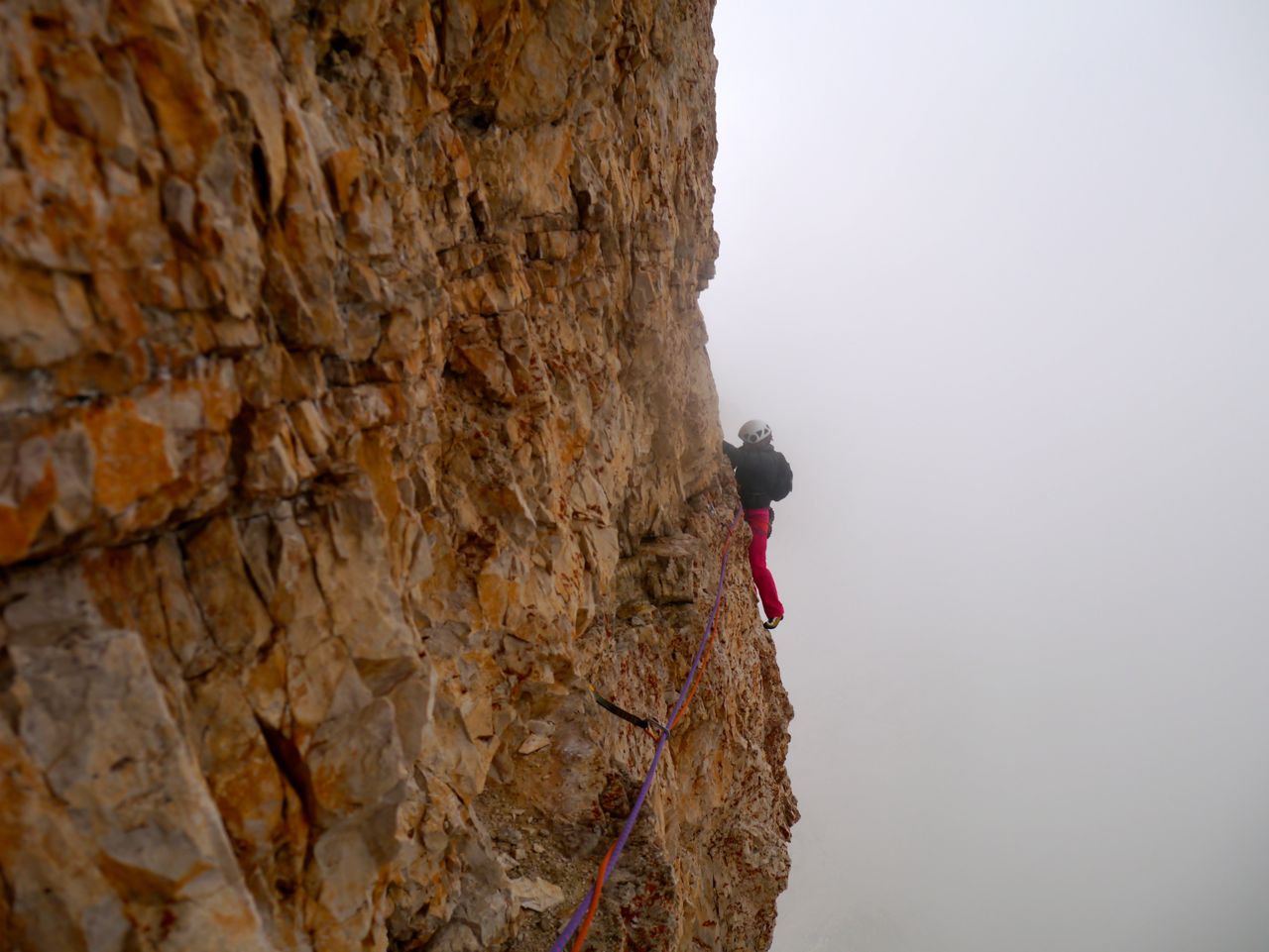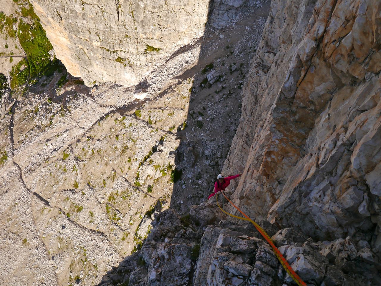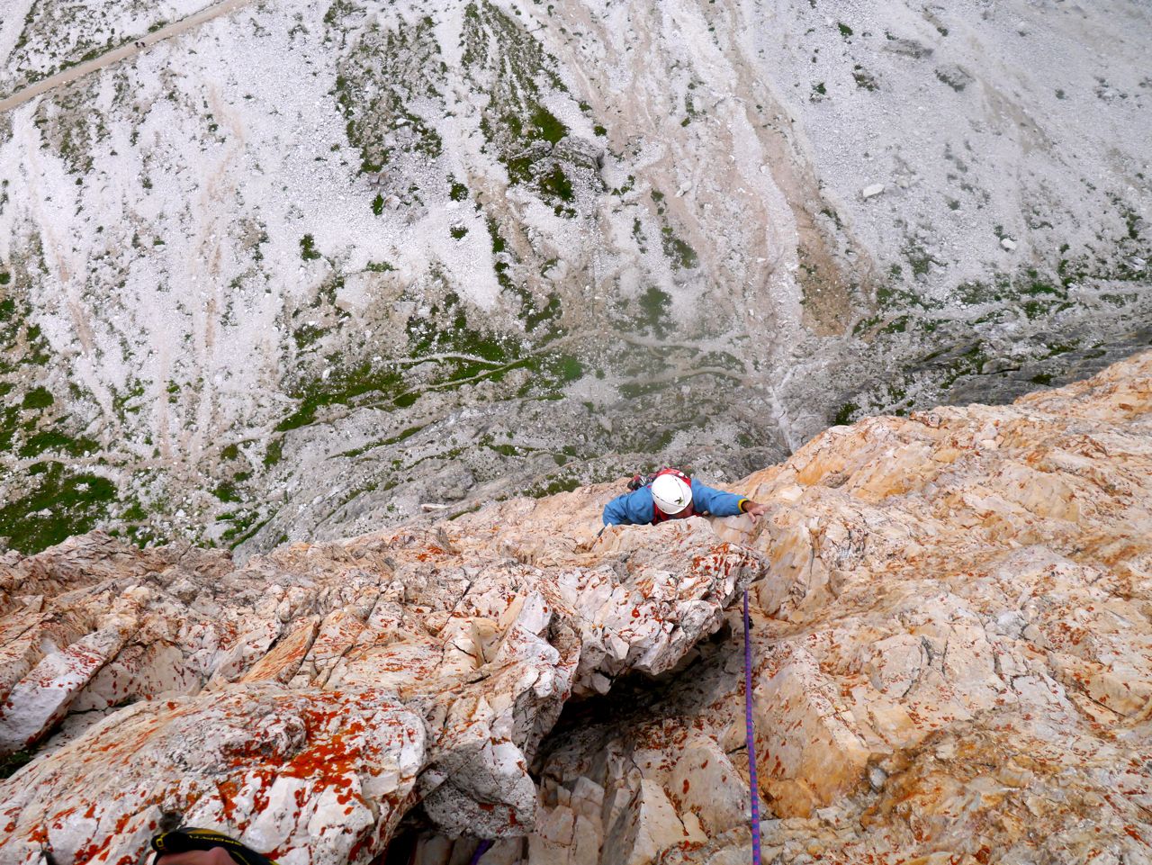 L'escalade dans les Dolomites (et particulierement aux Tre Cime) est souvent raide et engagée, parfois exposée. Il faut savoir poser ses protections.