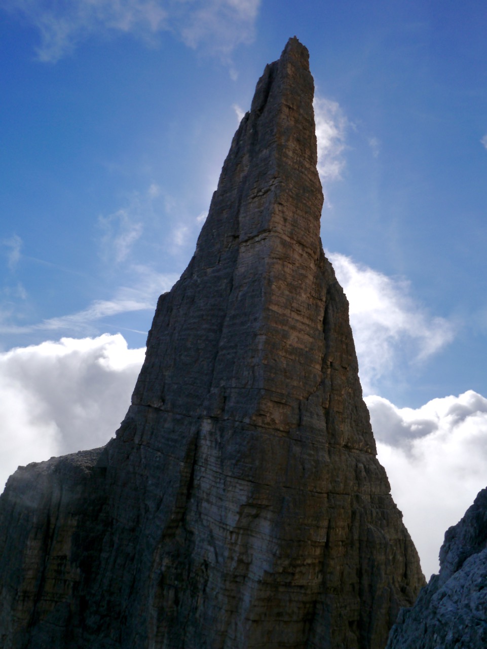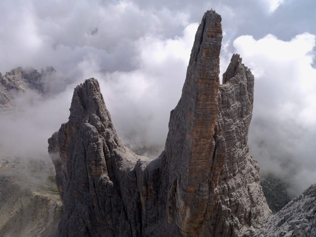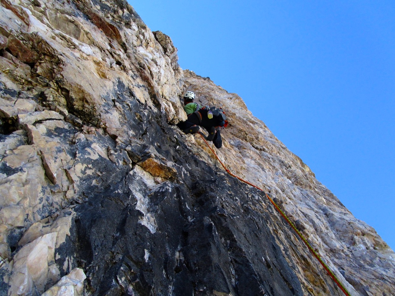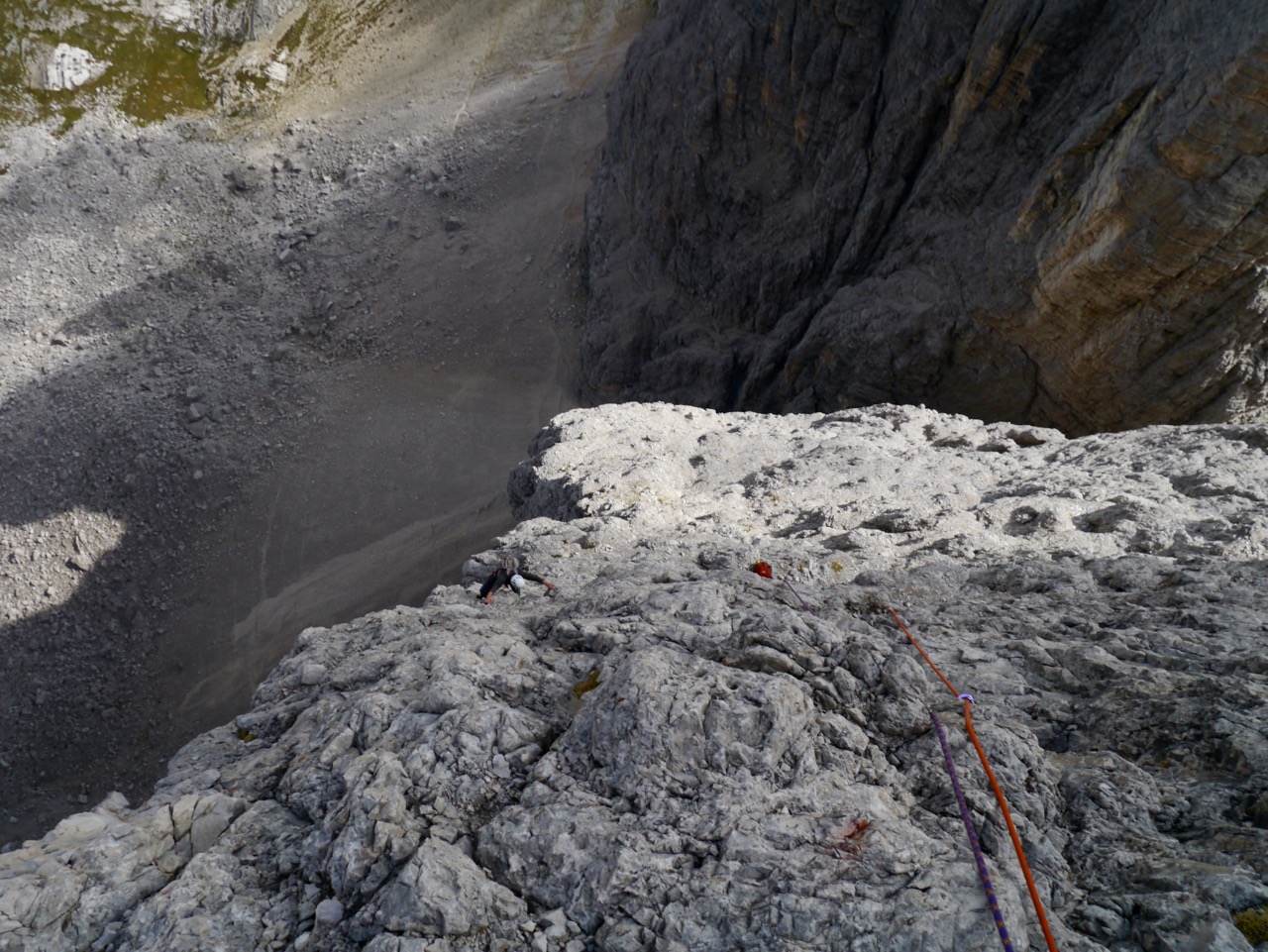 L'escalade dans les Dolomites (et particulierement aux Tre Cime) est souvent raide et engagée, parfois exposée. Il faut savoir poser ses protections.